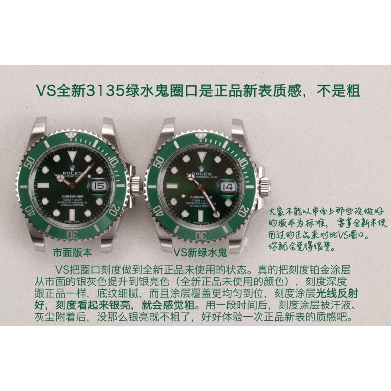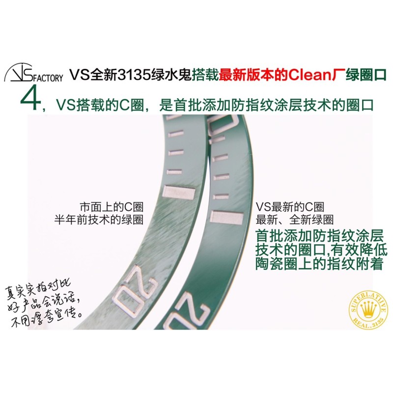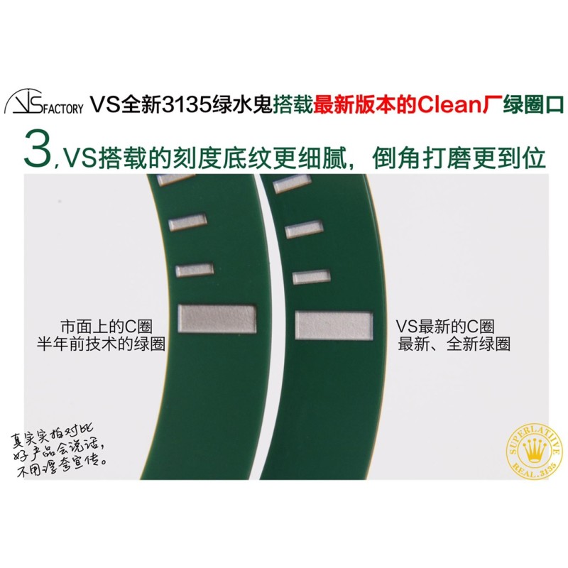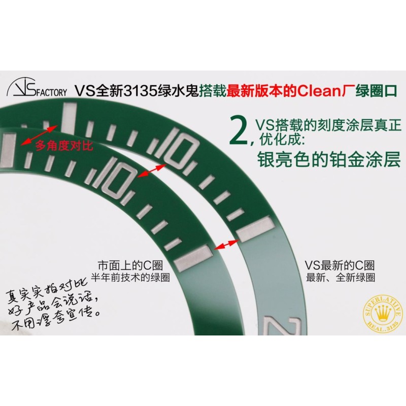 VS全新3135绿水鬼搭载最新版本的Clean厂绿圈口(最新的!+VS自造夜光珠,不用担心夜光珠颜色太黄!) 1,VS搭载的绿色陶瓷更翠绿,更自然的微微泛黄; 2,VS搭载的刻度涂层真正优化成:银亮色的铂金涂层; 3,VS搭载的刻度底纹更细腻,倒角打磨更到位; 4,VS搭载的C圈,是首批添加防指纹涂层技术的圈口… 真实实拍对比,好产品会说话。