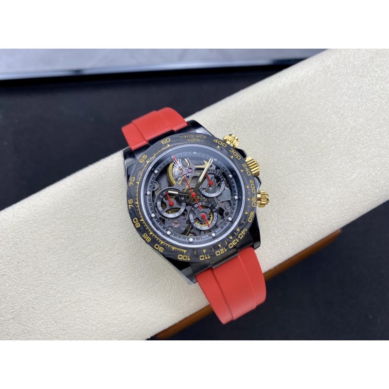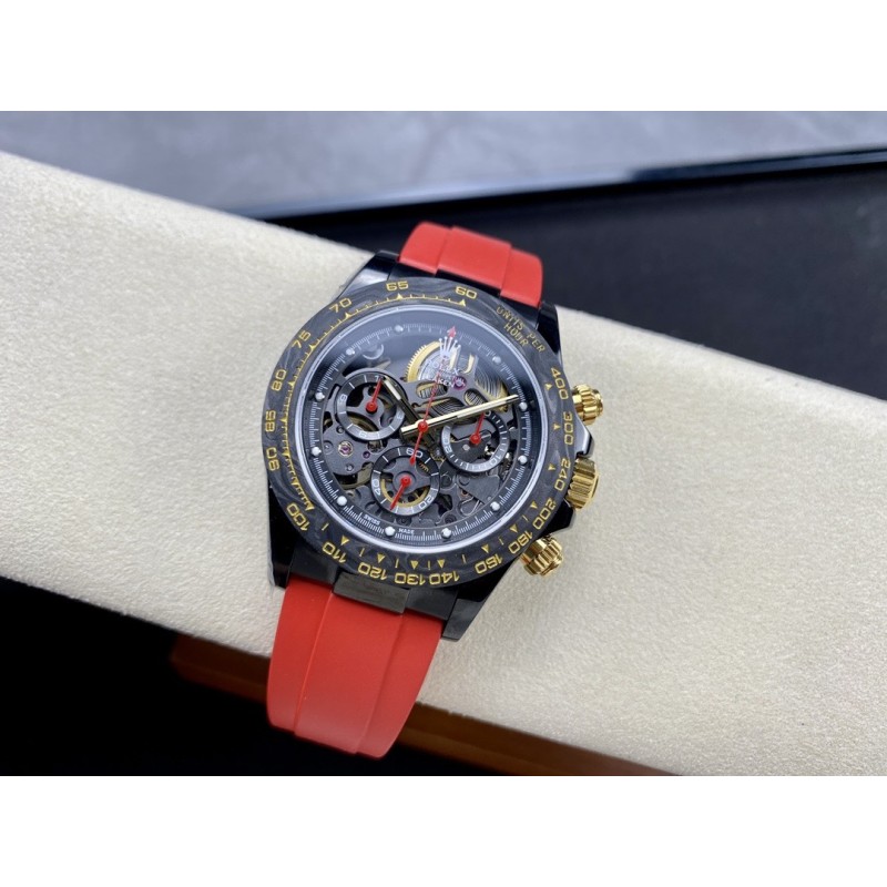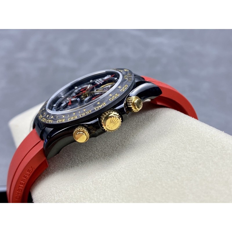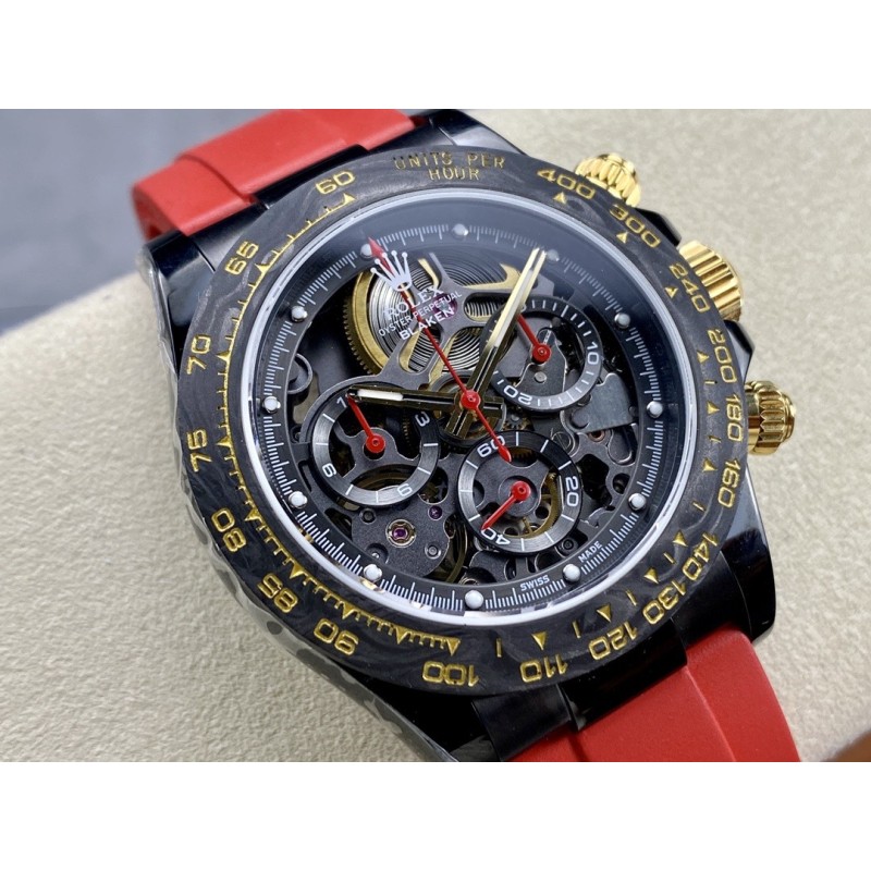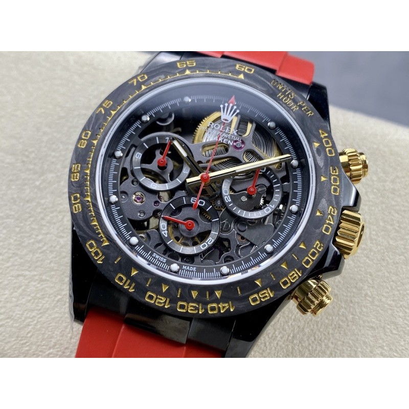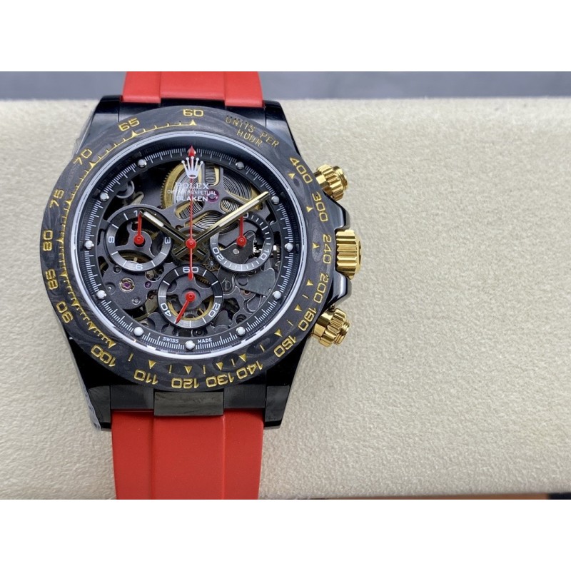 “时间,从未如此令人惊艳。” GET公司引以为傲的全新镂空劳力士迪通拿腕表,将为您的手腕注入更多时尚与品味。通过其独特的设计,这款手表不仅可以告诉您时间,更能展示您的个性与品味。GET公司独家花费巨资研发复刻和4130一样功能级别,走时精准,稳定, 真动能摆轮。每个拆件都以非常高的精度逐一拆装,进行缕空和手工制作切角,让缕空、主板,桥梁甚至主发条盒完全展开,大多数部件经过涂层、斜切以及抛光等精湛工艺,全缕空展现出来、赏心悦目! 别具匠心的镂空设计,将整个机芯镂空呈现,让您不仅可以清晰地读取时间,更能领略机械时钟的精密内部结构,营造出整个手表优美的空间感。 玻璃上下面采用了高透镀膜蓝宝石防刮伤材料,让您可以随时欣赏机芯的运行。表圈采用定制表圈,为NTPT锻造碳材料和精密陶瓷圈,人工彩色宝石圈,一体加工成型、坚硬耐磨!而表带采用进口原版开模胶带,穿戴舒适,质感优良。此外,手表还配备了防水、防震等多重功能,让您在不同场合都能放心佩戴。外壳镀黑非普通电镀,采用与BLAKEN改装厂一样耐磨抗造的DLC涂层材料,其后期让消费者可以用时间验证其电镀技术含金量。 GET公司联合全力花重金真诚打造,以品质打动消费者,让体验其真正价值!现在就选择这款镂空手表,让时间成为您的独特标志,展现您的品味与魅力!