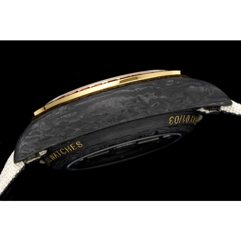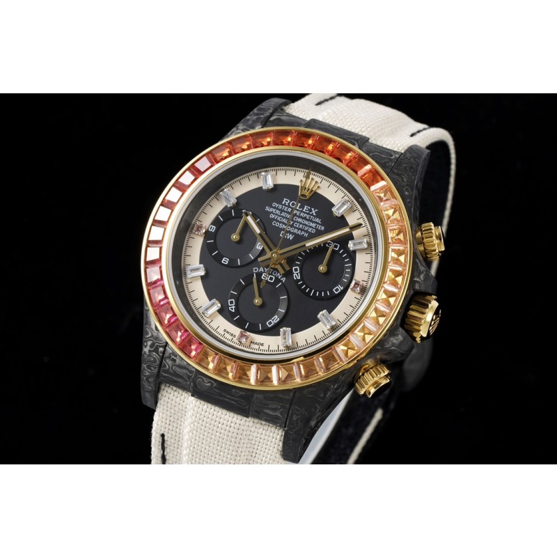 DiW 打造 Rolex Daytona 全新定定制款「Rainbow Sunray」阳光彩虹 以阳光为灵感的彩虹圈,整只表散发出和煦的金黄光芒,看起来既耀眼又温暖。在面盘设计部分,外围刻度环为米黄色,至于面盘内侧则是黑色,包括三枚小表盘的刻度环也都是黑色(但有做出太阳纹与纯粹黑色的面盘形成自然层次)。透底可见的4130机芯,更具有机械质感,并搭配了佩戴舒适的皮质内衬 NATO 规格尼龙表带。推出2款颜色可选,玫瑰金/黄金