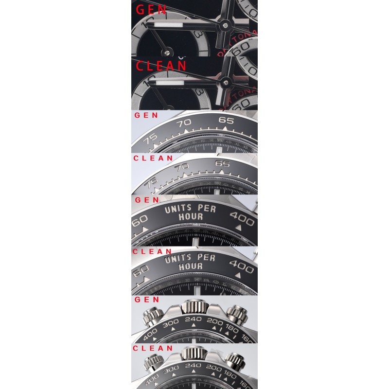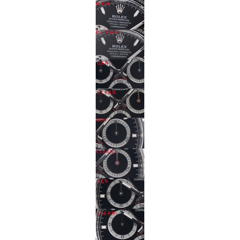 c厂4131新款 126500 黑色 通过图片对比大家比较关注的点 表盘的三个银色小圈,4131更新最大的部分,小圈边缘多了一个亮圈,这点clean做的很好,斜度、亮度。但是银灰色的小圈,我个人觉得底纹相对于真品还不是那么细腻,但是肉眼不可见,具体可以看自然光对比。 其他部分 字钉 夜光 做的也很好/ps:上面有讲到真品4131以后指针的管头更改为圆柱形,但是clean提供的4只真品,我们发现了几个问题,例如 字钉的圆润度存在差异,指针有使用老款的锥形管头,所以劳力士官方可能在清理4130的库存。 表壳 表带上面也有图片对比,整体外观差异不大。 虽然这次时间特别紧张,但是clean在第一时间购买真品五只,据说手表本身的价值跌幅已经超过10w美金,这个当中不包含已经拆卸的手表,以及损坏的零件。 我仔细看过真假实物,也通过拍照进行对比,我个人觉得是一次非常好的创作。 选择sh4131当中有非常复杂的关系,但是希望大家能够理解 sh不等于低端品质,同样clean也从来不会因为想获取更多的利润从而降低采购成本,clean告诉我,这次sh4131机芯采购成本并不比dd4130低。 可能因为光线的问题。会附上自然光实拍图,我觉得可以以实拍图为准。
