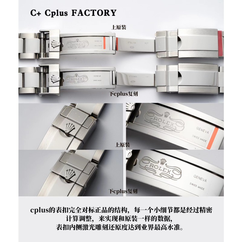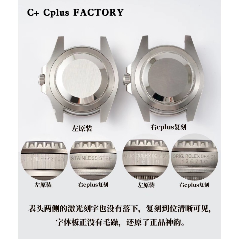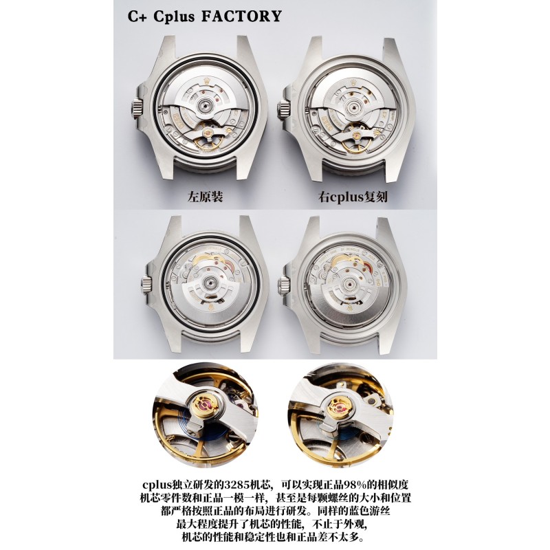 C+ Cplus重新定义了顶级复刻——劳力士格林尼治II型可乐圈 40MM表径,表壳整体904钢材打造,金属拉丝工艺升级,细腻的拉丝手感和正品一致 独家研发红蓝色陶瓷圈,经过反复调色烧制实现了零色差,圈口刻度镀银肌理细腻,光泽明亮 黑色表盘深邃不失优雅,LOGO字体也是多次对照正品进行微调,不再有误差。 刻度钉和表针夜光全面使用瑞士进口夜光粉,无论是颗粒感还是发光效果,均达到正品出厂标准 904精钢表带每一粒带节都一一打磨抛光,相互之间间隙微调到微米级别,做到和正品一样的“柔软” 机芯经过多年的研发和修改,一代代的升级迭代,达到了领先市场最顶级的3285机芯, 每一颗机芯出厂前都会经过长时间的测试,确保出厂即良品! C+ Cplus重新定义了可乐圈,为广大表友献上真诚!