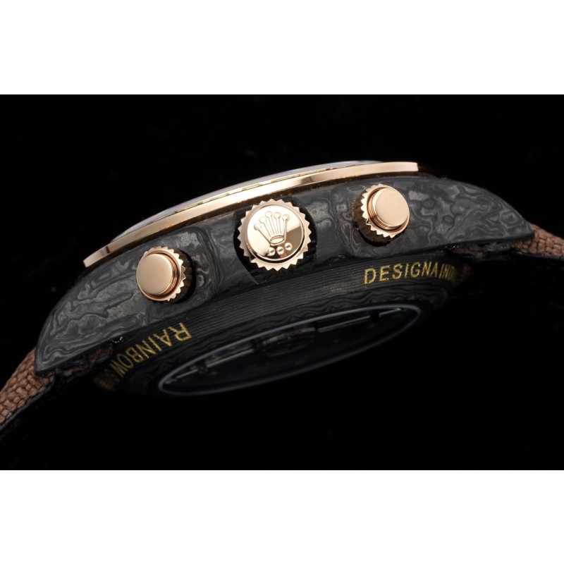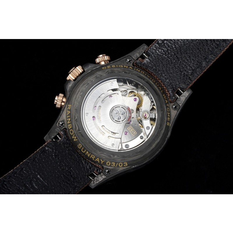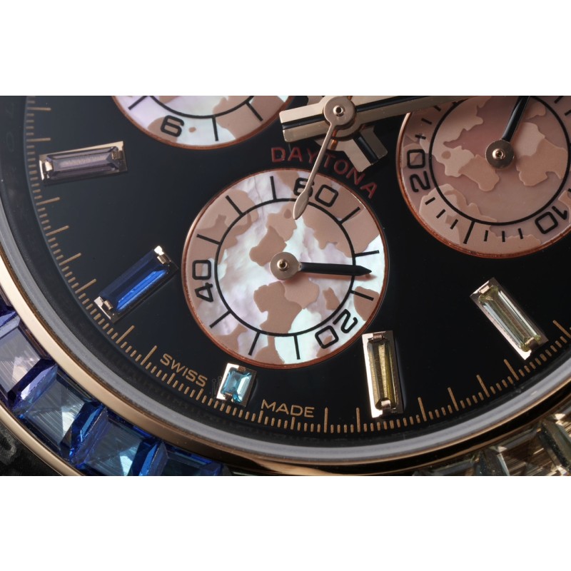 DiW 打造 Rolex Daytona 全新定定制款「Rainbow Sunray」阳光彩虹 以阳光为灵感的彩虹圈,整只表散发出和煦的金黄光芒,看起来既耀眼又温暖。在面盘设计部分,外围刻度环为米黄色,至于面盘内侧则是黑色,包括三枚小表盘的刻度环也都是黑色(但有做出太阳纹与纯粹黑色的面盘形成自然层次)。透底可见的4130机芯,更具有机械质感,并搭配了佩戴舒适的皮质内衬 NATO 规格尼龙表带。推出2款颜色可选,玫瑰金/黄金