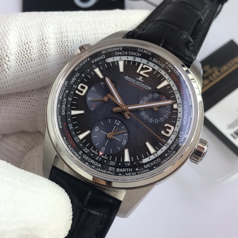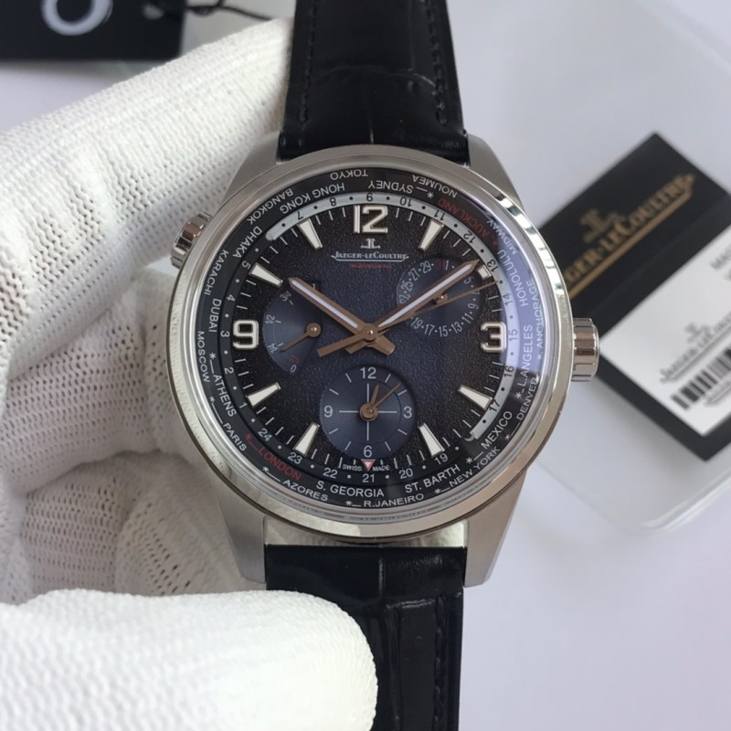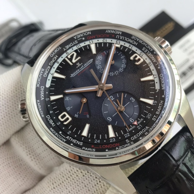 TWA出品 Jaeger-LeCoultre 积家 北宸系列 Geographic WT地理学家世界时腕表采用蓝黑渐变色与全黑色表盘 腕表的凸缘显示全球24个时区 成为行动派男士旅行期间的可靠搭档 佩戴者可透过10时位置的表冠设定 尺寸42mm表壳 316L钢壳 搭配拱蓝宝石“锅盖”镜面 采用亚洲机芯复刻版:936A/1自动上链 技术无与伦比 城市名部分以乳白色为基底 2时位置的日历显示 6时位置的第二时区显示和10时位置的动力储存显示副表盘饰以太阳放射状饰纹 进口牛皮 原装折叠扣 (实力拍,实拍无P图)