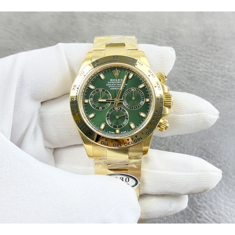 (严选)劳力士迪通拿116508系列,绿金迪!搭载丹东4130机芯,完全可以平替原版30多个w的货!40mm直径,电镀厚金,经久耐用!本次最大的特点在于这张金绿色的表盘市面上唯一对版的绿色。但是产能非常有限。表带部分也是使用3段式拼接头粒,全部散件电镀。表圈部分的字体粗细,以及最重要的,黑色填油是和原装一样的,磨砂质感!clean厂出品,出货实拍