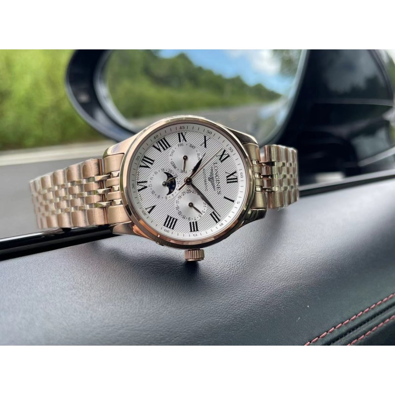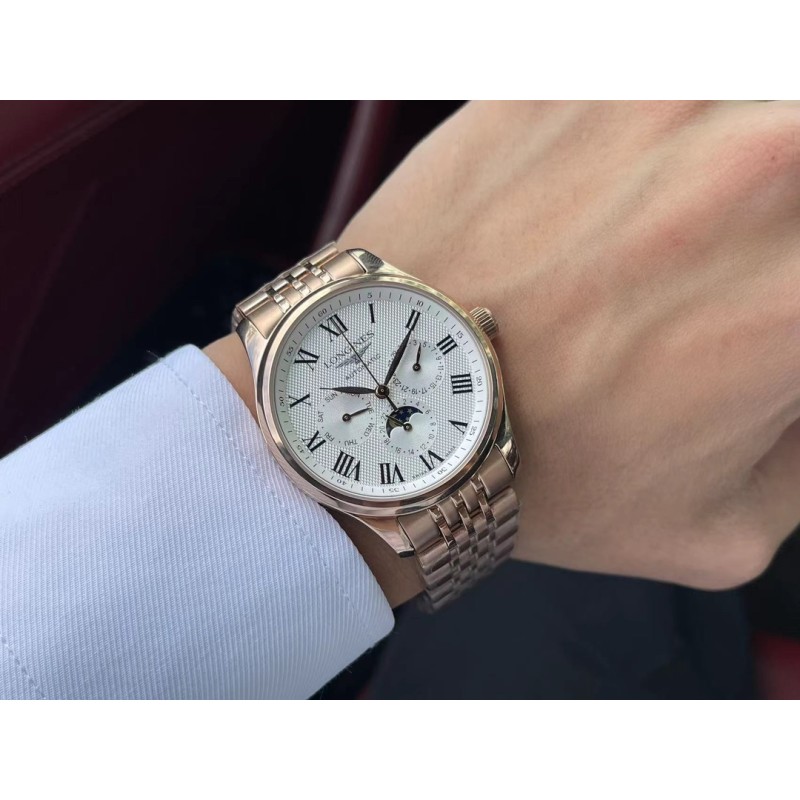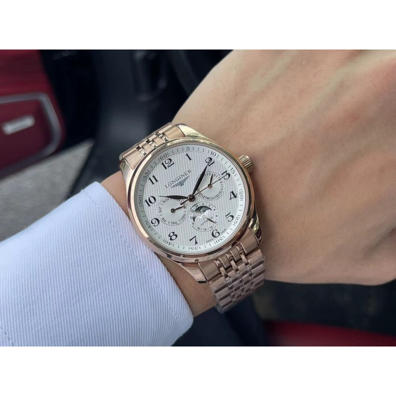 白壳520,玫瑰金540,钢带+20。浪琴名匠多功能腕表 3点6点9点位置分别设有星期 日期 24小时月相功能 采用3836机芯(稳定 走时精准) 壳侧身更是采用了拉丝工艺 让整体更加精致 耐用【全新升级 经典百搭】浪琴-Longines 男士腕表 全自动机械机芯 矿物强化玻璃 316L精钢表壳 进口意大利小牛皮表带 (表带背面更有同色皮纹) /316精钢磨砂钢带 (质感更好)时尚设计 商务休闲 尺寸:直径40mm 厚度12mm AD出品精品不断