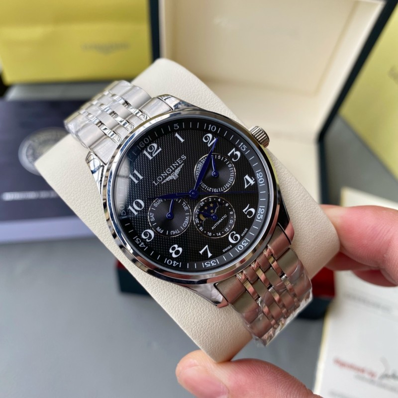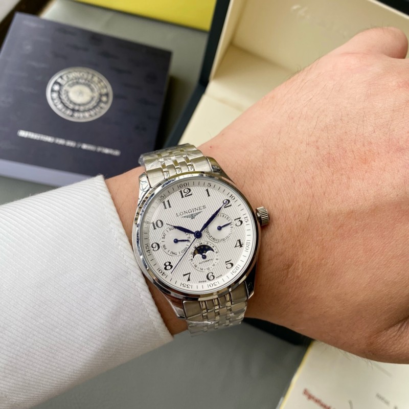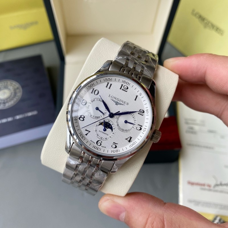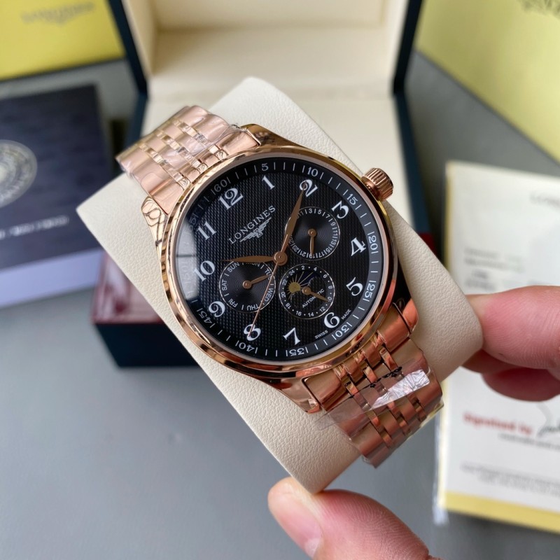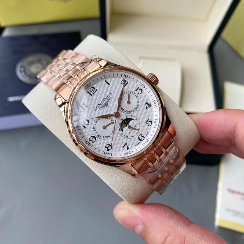 白壳520,玫瑰金540,钢带+20。浪琴名匠多功能腕表 3点6点9点位置分别设有星期 日期 24小时月相功能 采用3836机芯(稳定 走时精准) 壳侧身更是采用了拉丝工艺 让整体更加精致 耐用【全新升级 经典百搭】浪琴-Longines 男士腕表 全自动机械机芯 矿物强化玻璃 316L精钢表壳 精钢表带 时尚设计 商务休闲 尺寸:直径40mm 厚度12mm 卓越出品 必是精品