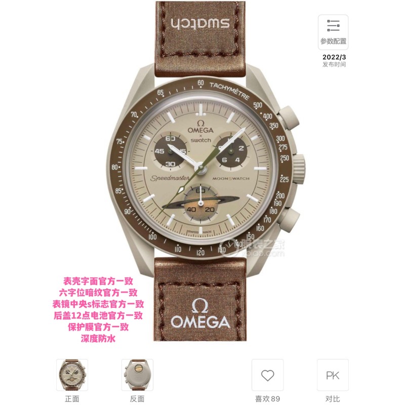 量大从优 欧米茄swatch联名 款式8号 土星款 咖啡色。认准品质。价格实惠。 SWATCH斯沃琪OMEGA欧米茄联名款 沙色、冷米色与棕色表盘,与 VELCRO 表带形成鲜明对比。表壳字面官方一致。六字位暗纹官方一致。表镜中央s官方一致。后盖12点电池官方一致。深度防水。保护膜官方一致。高强夜光。所有表盘均饰有 OMEGA X SWATCH 品牌标志、经典的 Speedmaster 标志和全新 MoonSwatch 标志。所有表款均采用剔透玻璃材质,Bioceramic 材质带来别致的细腻触感。表盘外圈和小表盘饰以精致圆形图案,时尚夺目的表耳结构,测速刻度表圈上点缀标志性“dot over 90”细节,细微之处体现高品质。所有时针、分针、计时秒针和时标均覆以 Super-LumiNova 夜光涂层,身处黑暗亦能清晰读时。