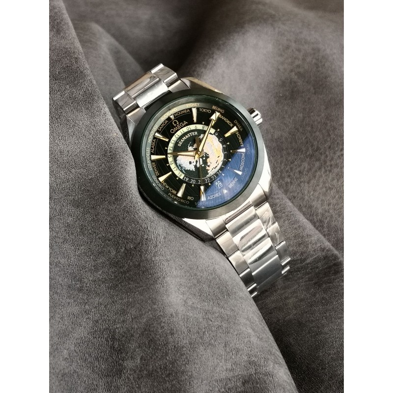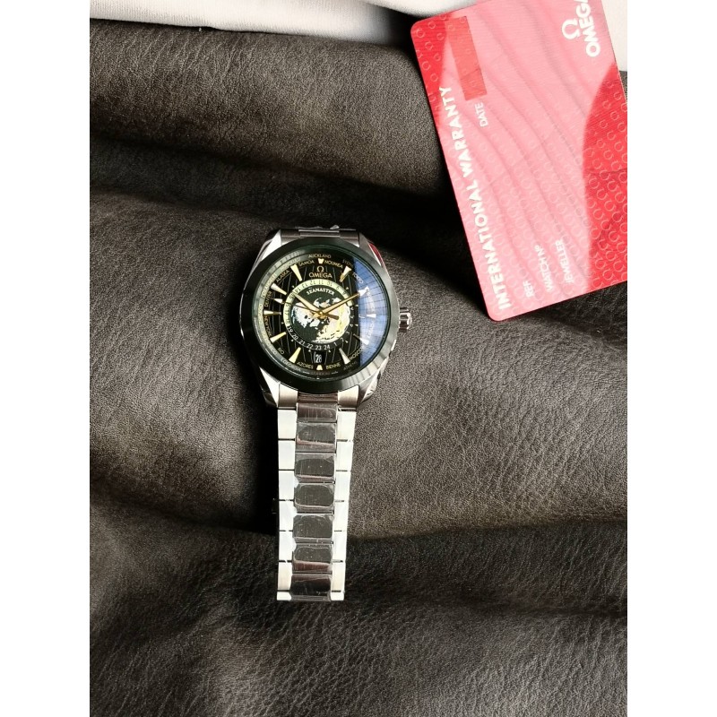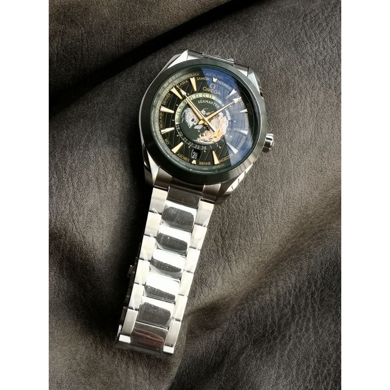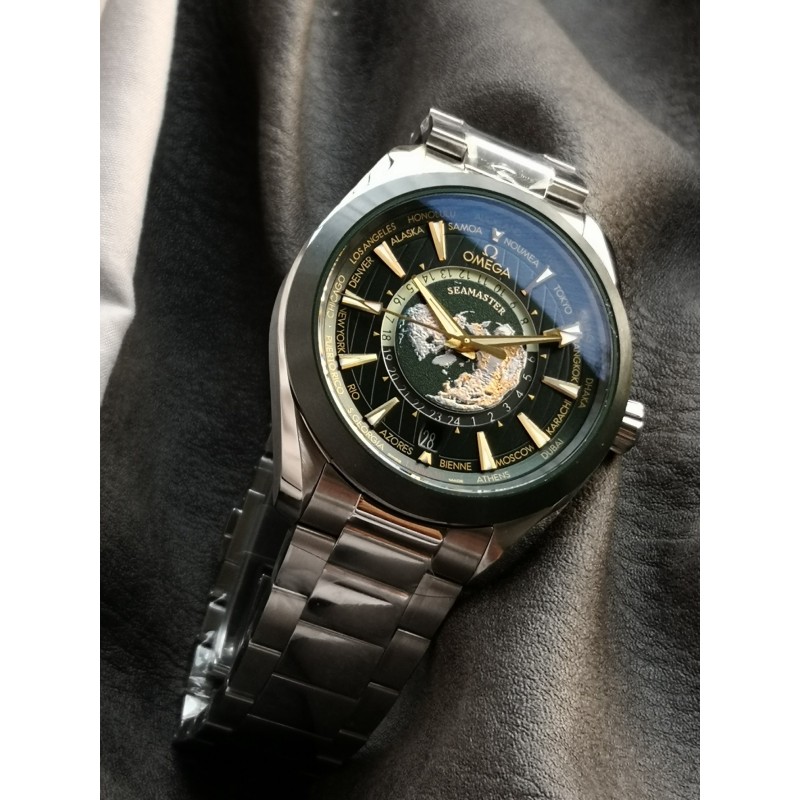 VS限量推荐:欧米茄海马系列220.30.43.22.10.001腕表,精钢表壳表链,蝴蝶扣,旋入式表冠,绿色陶瓷表圈,拉丝工艺处理,弧拱形双面防反光耐磨损蓝宝石玻璃表镜,绿色表盘,表盘呈现出太阳射线的打磨效果,表盘中央设有内表盘,5级钛金属表面呈现从北极俯瞰的地球影像,以激光烧蚀技术雕刻出陆地轮廓与色彩。外侧设有有机玻璃制成的24小时刻度环,并区分指示夜晚和白天。表盘周围环绕着世界各地的不同城市,其中包括欧米茄总部所在地瑞士比尔市。所有地区名称均采用金黄色,而英国首都伦敦则采用红色,以突出显示格林威治时间,即世界标准时间(UTC)。小时刻度和用于指示世界时的指针均由Moonshine 18K金制成。搭载CAL.8938型自动机械机芯,尺寸:42毫米