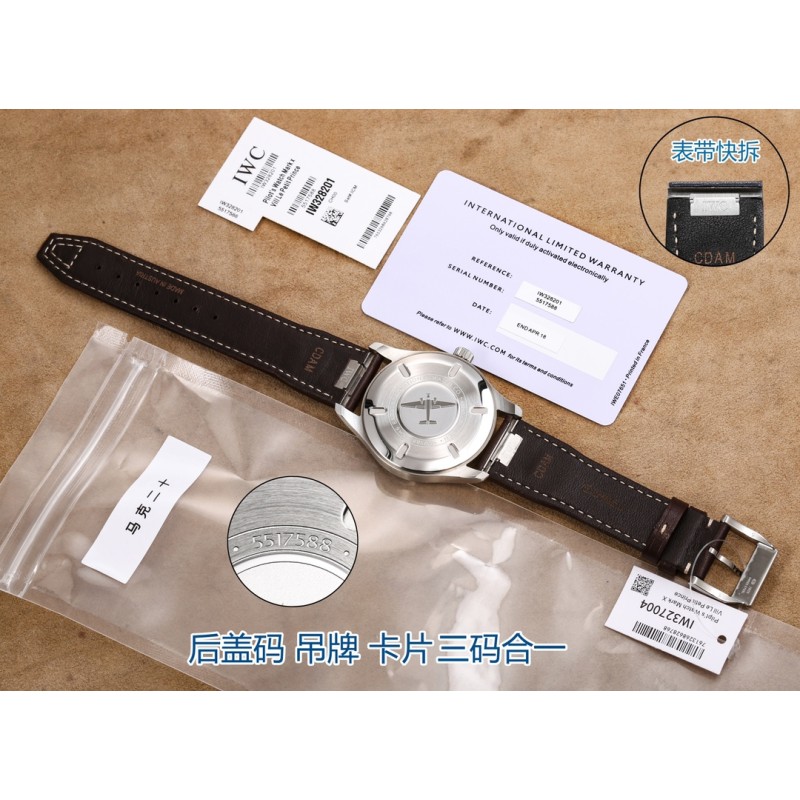 24机:1000 9015机:1050 2892机:1250 实惠优质版V7厂(三码合一)万国飞行员系列上市! 首款马克二十搭载(2824和9015和2892)三种机芯,任你选择,日历的字体是完美油印100%和原版相同的字体,表盘中覆盖夜光涂层的镀铑指针、标志性的白色时标及“12点钟”位置三角标志均得到了保留。盘面上的荧光元素和指针在任何光线条件下,都能确保可读性。 皮带采用自动拆卸头粒,轻松拆卸安装,采用马克原版进口小牛皮,做工材料实现100%同步,佩戴手感直逼原装,全新开模的表扣,打磨刻字功底扎实,表扣与表带均采用EasX-CHANGE自拆装置,更换简易,实现无工具拆卸安装表带! 表圈采用镜面抛光处理以凸显立体感。其直径,厚度,弧度包括底盖边缘线条细节也不放过100%温和原装,边角打磨亦十分到位。密底设计又给腕表完美度加分,V7底盖拉丝完美还原,各角度均无死角。 V7厂马克20,系行业同款唯一敢于呈现真假对比评测的版本,修正市面现有版本不足,其结构以及细节均按原装逐一复制,拆解后与原装完美保持一致,真正完美克隆,欢迎品鉴!