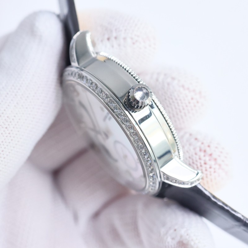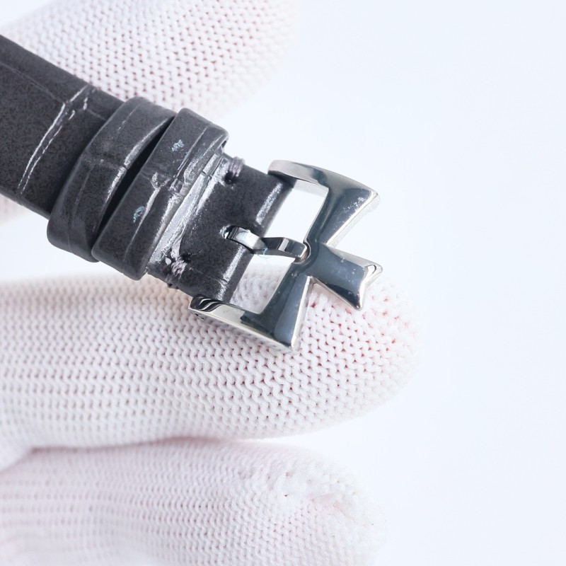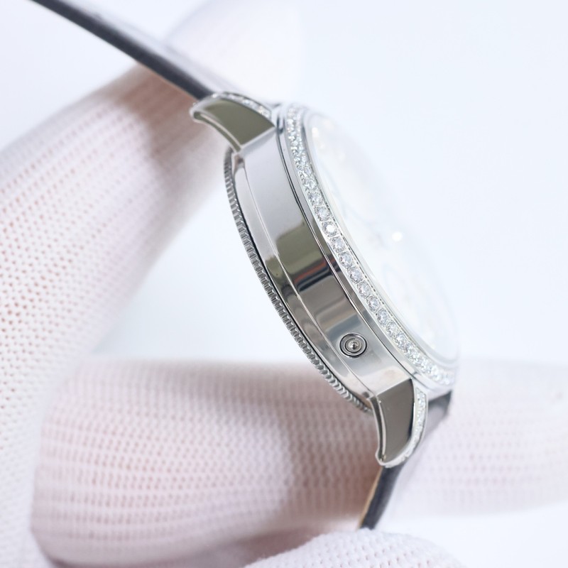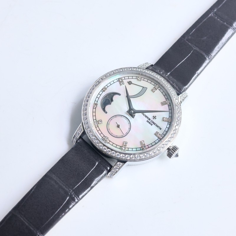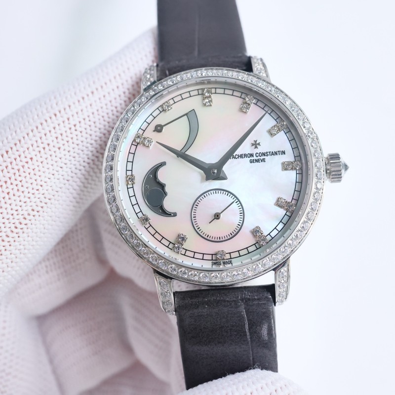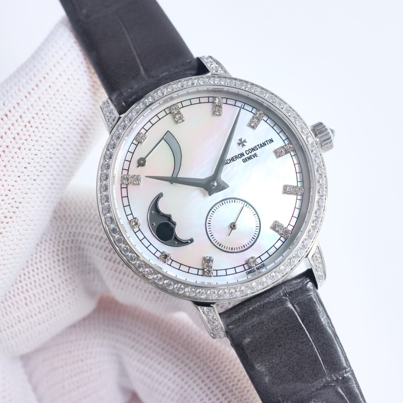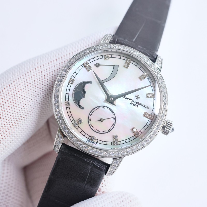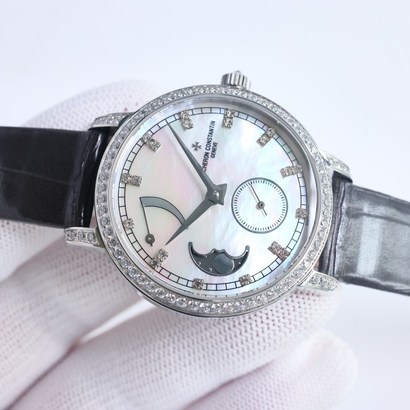 白钻 1600 金钻 1650 钻面200 江诗丹顿 VC GV1 传袭系列 月相腕表搭配直径36毫米 圆形白金表壳,表圈、表耳和表冠镶嵌了总重约1.2克拉的81颗美钻 白色珍珠贝母表盘之上配备了高级腕表所有复杂功能当中最富诗意的月相盈亏显示功能。 腕表搭载由江诗丹顿自主研发并制造的机芯,动力储存约72小时,可为小时、分钟、小秒针及月相盈亏显示功能提供充足动力。 腕表还搭配了低调优雅的意大利小牛皮带优雅柔媚的设计是日常搭配的上佳之选。S1精致推荐女士多功能机械腕表