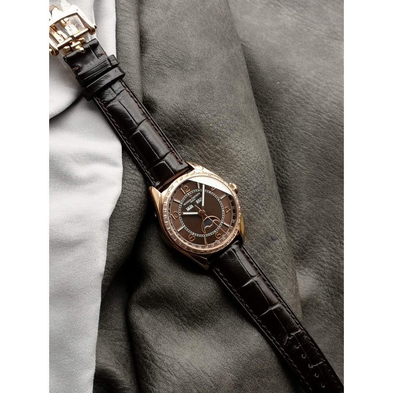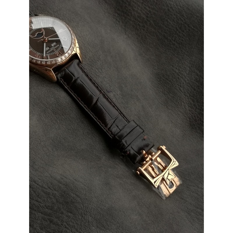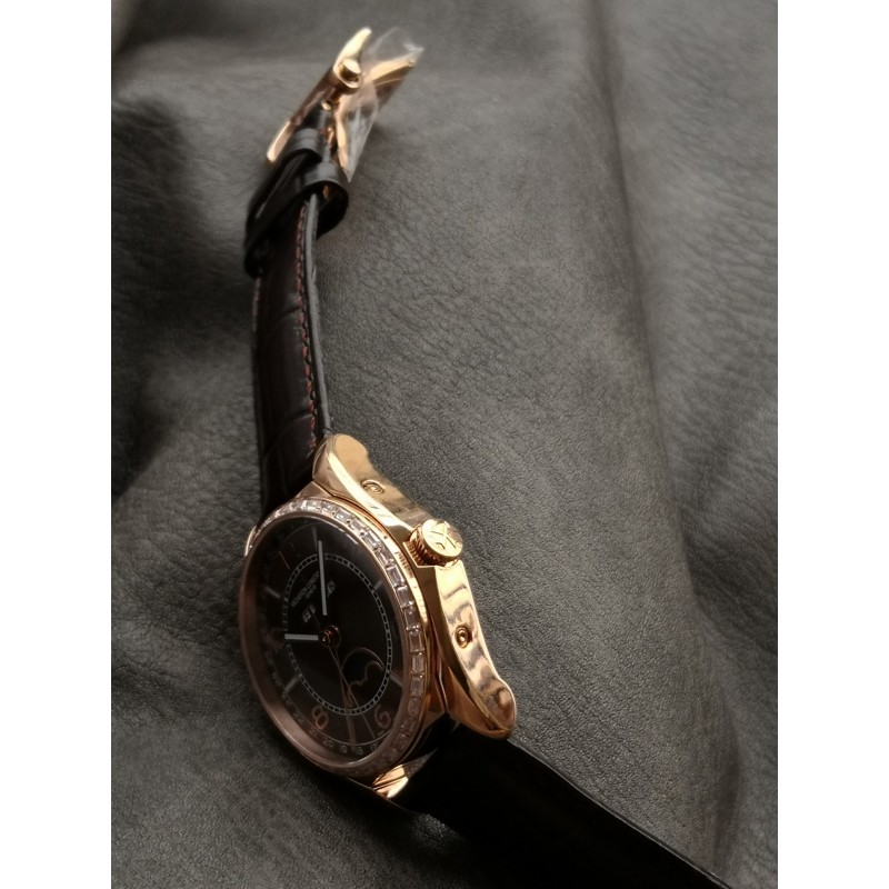 TW力作——【VC江诗丹顿伍陆之型—FIFTYSIX全日历系列】腕表 【型号】4000E/000A-B548/B439/B438/B065 【表壳】尺寸40mm×12.8mm,真正同步原装。旋入式表冠和造型独特的盒式蓝宝石水晶镜面,提升耐磨耐用性的同时,保留了FIFTYSIX伍陆之型系列的复古韵味。 【表盘】12点钟位置两个矩形视窗,分别可以显示星期和月份。日期显示位于表盘外缘,由带箭头的烤蓝指针指示。6点钟位置为月相显示,由蓝色的夜空和白金月亮组成。刻度圈配以白金材质的阿拉伯数字和棒状时标,与深邃的月相盘相映生辉。 【机芯】不惜成本力求完美历时18个月,全新研发2460 QCL/1自动上链机芯,完美修正市场其他版本的不足之处:①摆轮位置与原版一致;②所有快调按键位置及功能均与正品完全一致。③日历指针等位与原版一致隐藏于时针之下。细微之处见真章,真正做到市场唯一最高版本! 【表带扣】格纹意大利进口小牛皮表带,精钢折叠式表扣呈半马耳他十字造型,经抛光处理,尽显低调优雅!!!