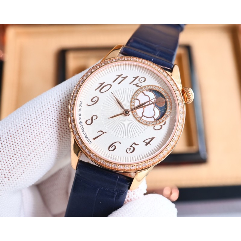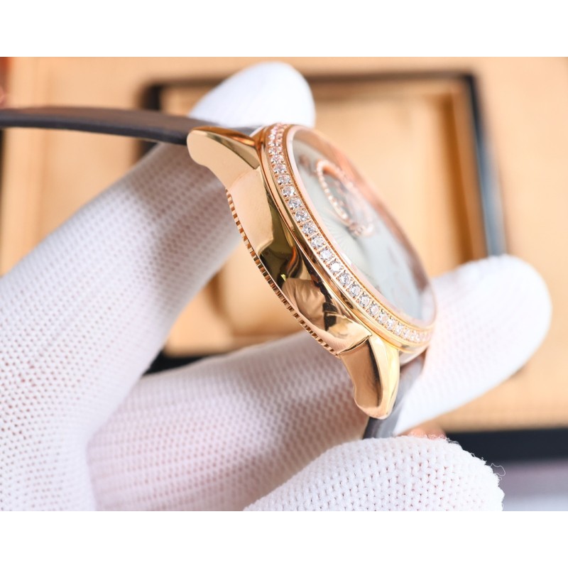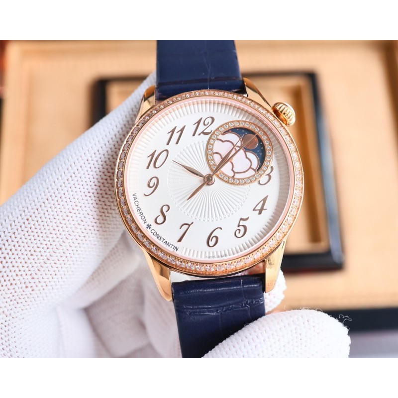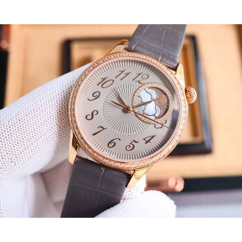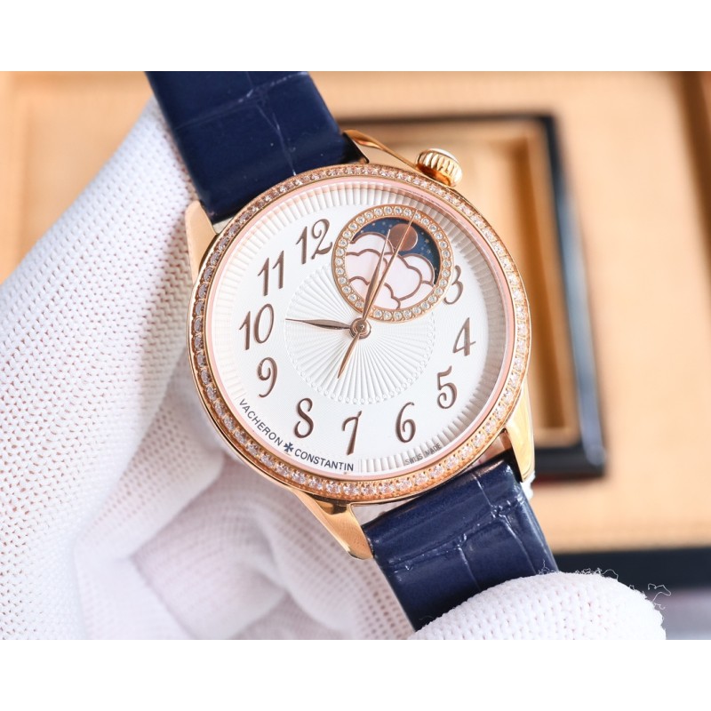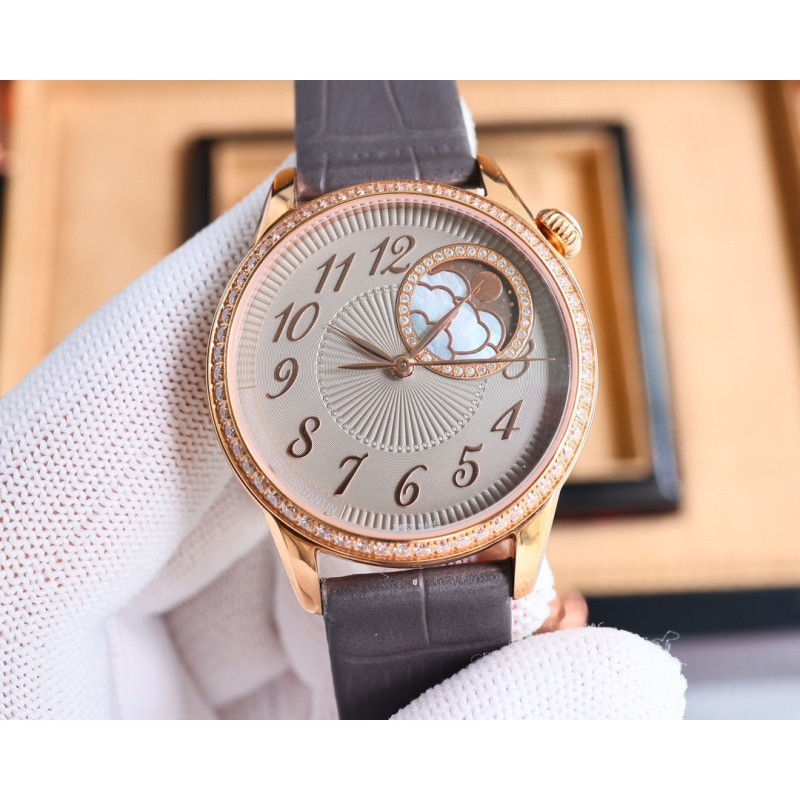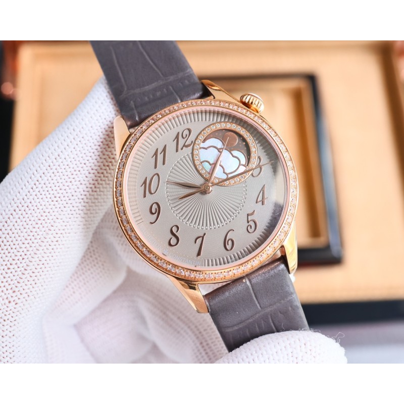 白1750-金1800,江诗丹顿Egérie伊灵女神系列再添新作!沉淀时光雅韵,流转日夜芳华。超薄机械女式腕表延续系列风格!全新乳光表盘以璀璨美钻相饰,褶皱纹饰历经数月调试,运用传统的“织锦(tapestry)”工艺制作而成, 表冠上饰有象征沉稳与静谧的弧形切割月光石,闪耀钻石的偏心式圆形表盘以梦幻般的方式展示时间,精美的珍珠贝母被雕琢成朵朵白云。直径37毫米,搭配进口9015改1088L自动上链机芯,完美呈现月相功能,典雅奢华专为女性鉴赏家倾心打造AD出品 精品不断