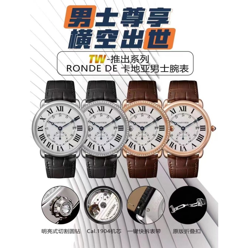 白1300,金1350 钻+50 台湾厂出品,精品复刻,敬请品鉴。 TW 推出卡地亚伦敦系列 RONDE DE CARTIER 男士腕表采用 Cal.1904 机芯 动力储备 48 小时。 表径 40毫米(同步正品)意大利牛皮搭配原装折叠扣 防水深度 30 米。 雕纹表盘 罗马数字时标 苹果形蓝钢指针 。表壳材质 316L精钢,表镜前后蓝宝石玻璃。 圆珠形把的 镶嵌一颗明亮式切割圆钻 既高端又奢华。