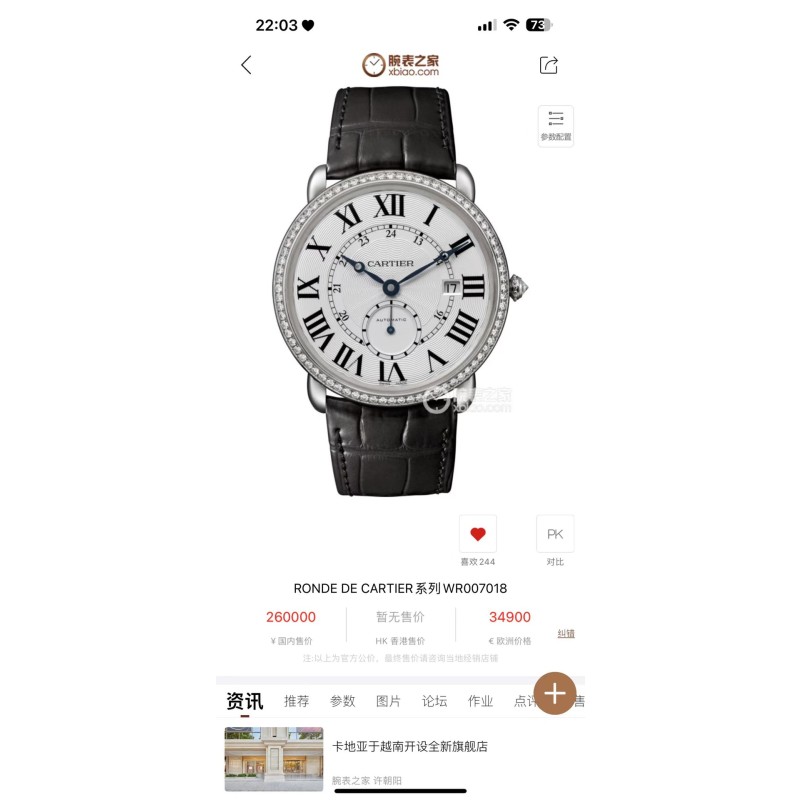 白皮500 玫皮520 白钢530 钻+50 卡地亚 Cartier全自动机械头层小牛皮拱形蓝光玻