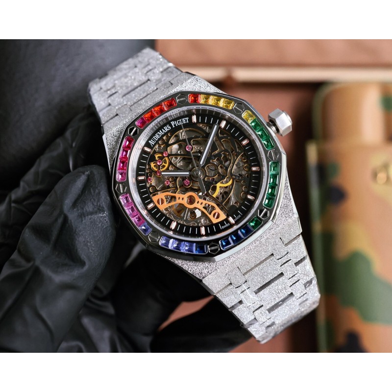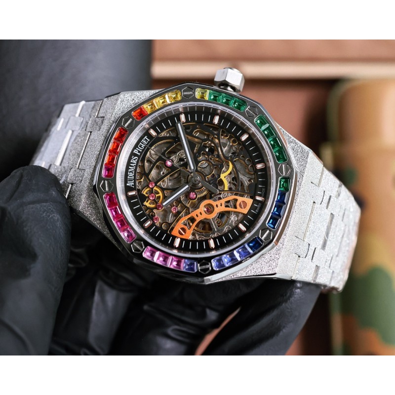 白壳800 玫金820 爱彼Audemars Piguet全新推出皇家橡树系列双摆轮镂空霜金腕表,分别搭配以彩虹色设计的宝石镶嵌表圈。全新表款展现出精湛细节,注重色彩、材质和手工润饰的完美协调 品牌:AudemarsPigue 系列:双摆轮镂空腕表 机芯:全自动机械 表带:流沙霜金带 尺寸:直径41mm厚13mm 材料:316精钢打造-蓝宝石镜面 新品腕表 运动元素 美学设计