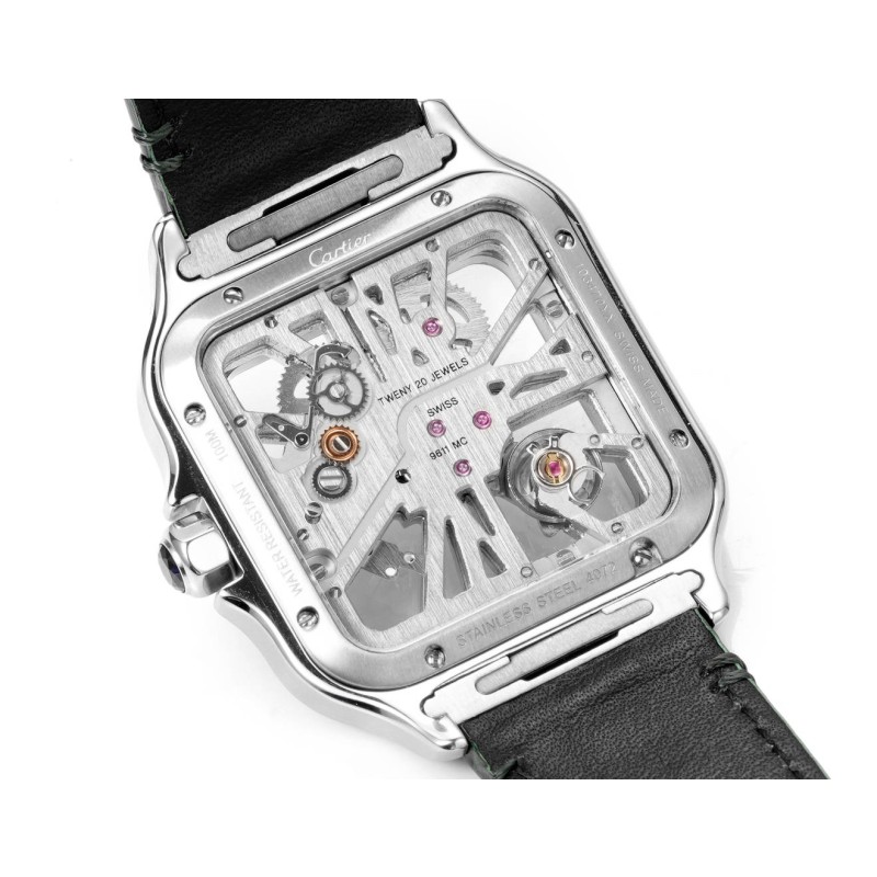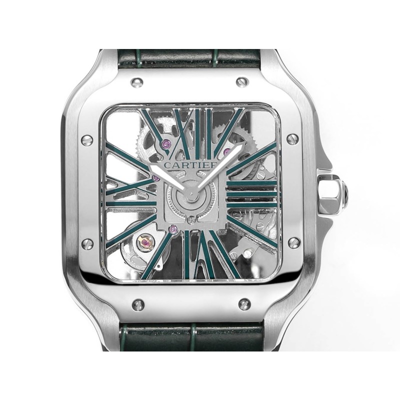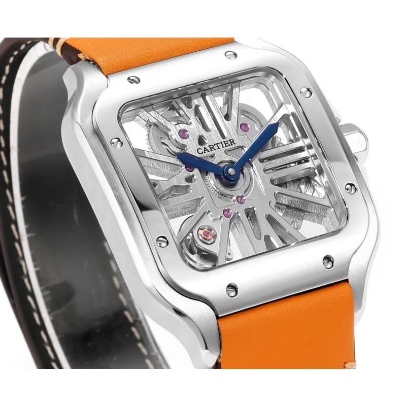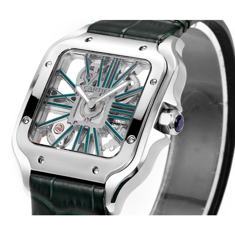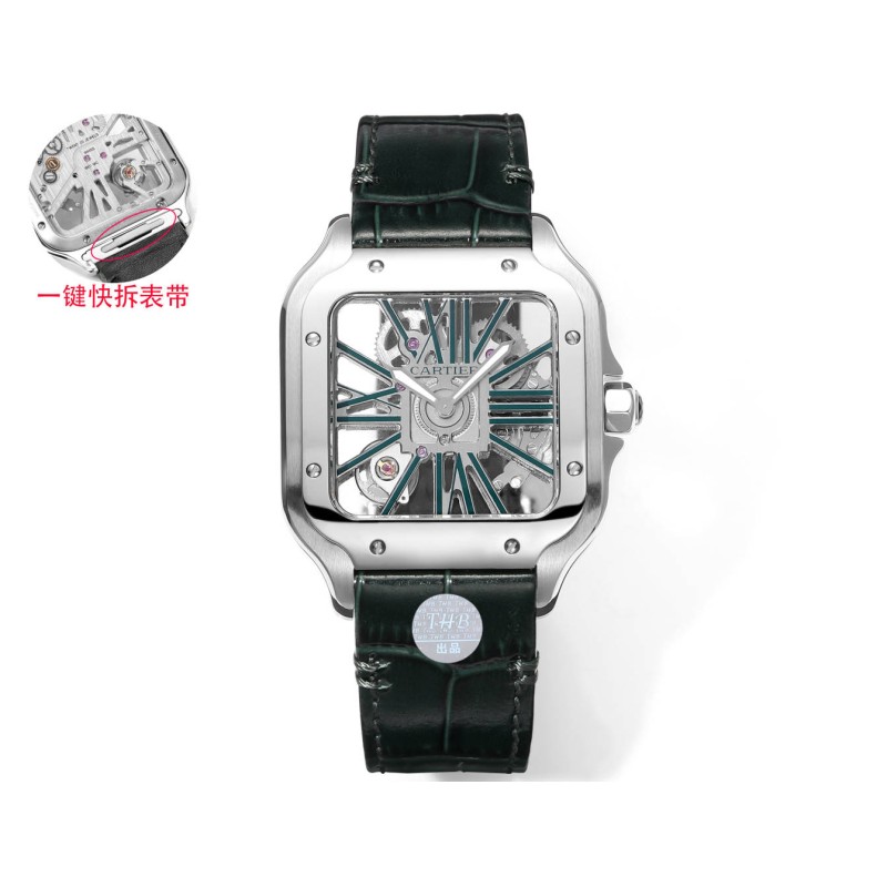 THB 山度士镂空皮带快拆系列 2024首发 参数与正品同步 表径:39.8毫米 机芯:瑞士朗达4S20改制机械款机芯 表壳厚度:9.08毫米 表盘颜色:镂空 表盘形状:方形 SKU:黑色 银色银圈 银色玫圈 银色金圈 表带:采用进口意大利小牛皮层 表扣:采用卡地亚原装扣 背透:背透 镜面:蓝宝石镜面 指针:蓝色烧钢蓝指针 黑色款夜光采用进口绿色亮光 表冠:宝石镶嵌表冠