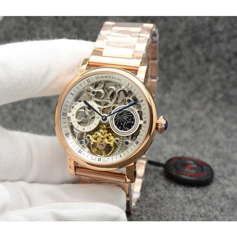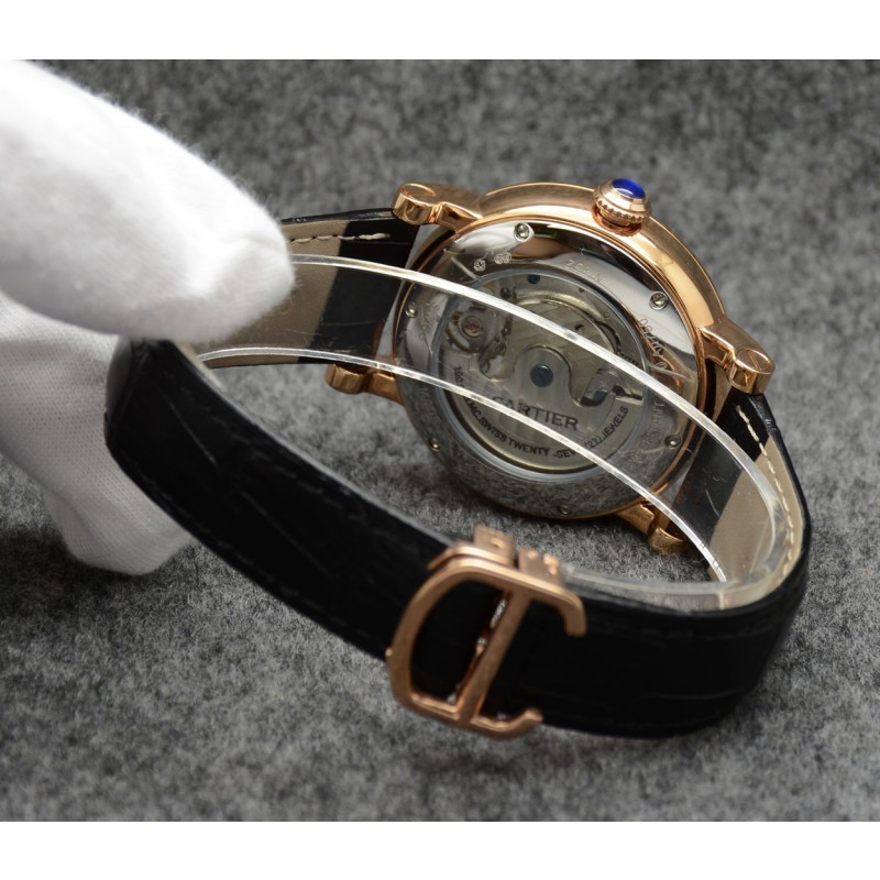 卡地亚 Cartier最新款男士机械腕表[悠闲] [鼓掌]精钢表壳,抛光打磨!表盘采用飞轮镂空设计,精雕细琢,尊贵大气上档次!内置全自动机械机芯,走时稳定!搭配进口牛皮表带,高硬度矿物质蓝光玻璃镜面,商务休闲皆宜!【尺寸:43.5mm 厚度:14.5mm】编号:386920 (金20,钢带20)