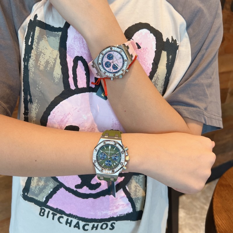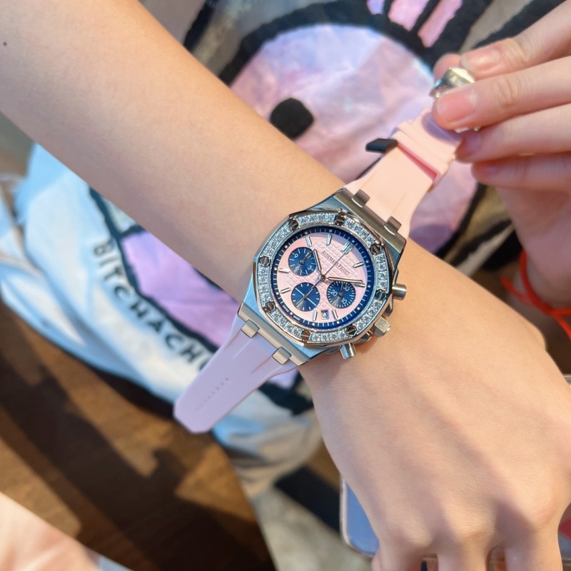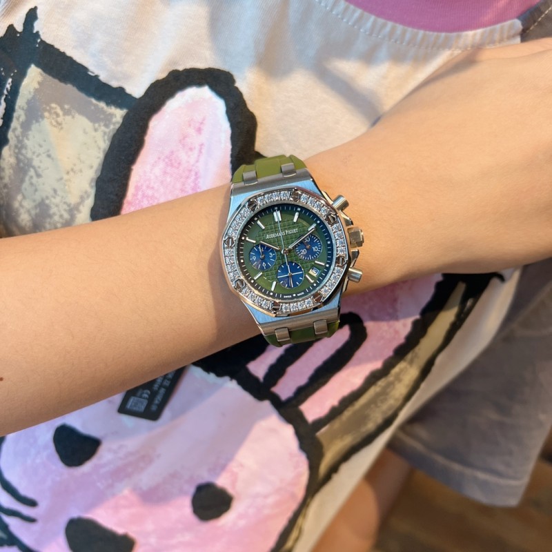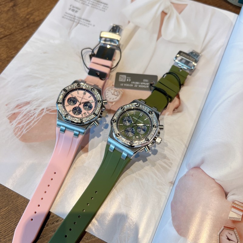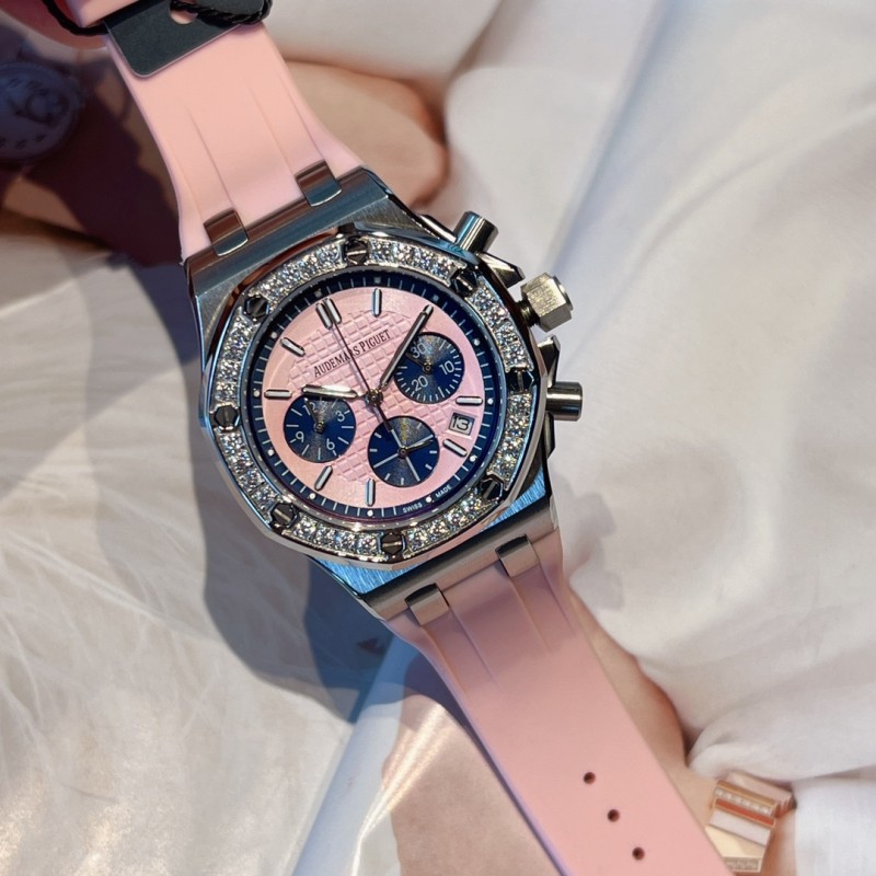 420网红爆款AP爱彼皇家橡树系列全新色系--樱花粉VS橄榄绿 美女几乎人手一枚!精钢表壳镶钻八角钻石壳边设计 进口日本多动能石英机芯 稳定带计时功能 蓝宝石水晶镜面刮不花玻璃 采用食品级别安全橡胶表带亲肤无毒性 百搭尺寸37mm任何女士手型都可以佩戴,MF厂高版本值得拥有