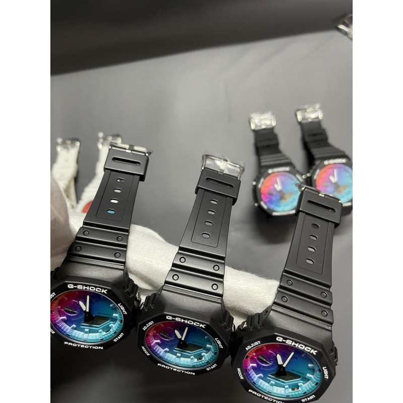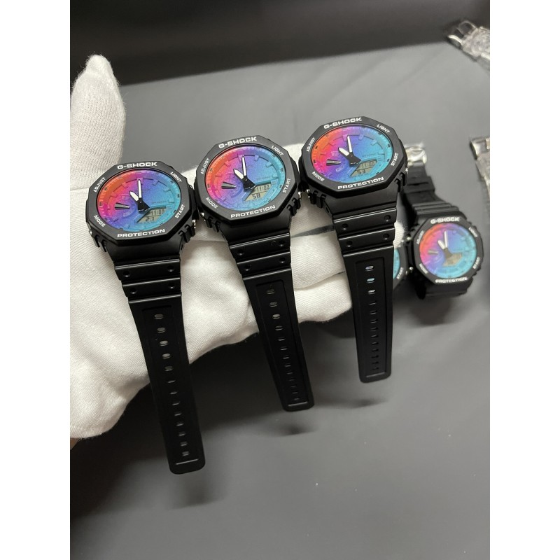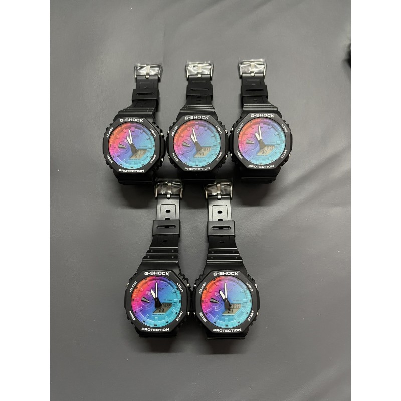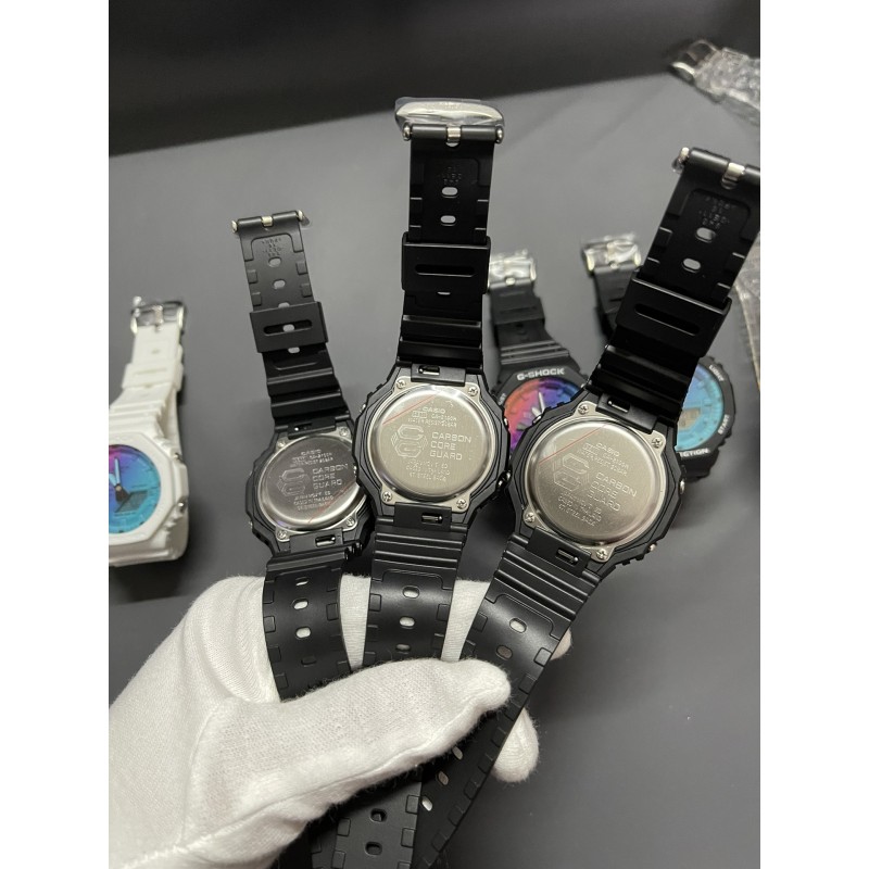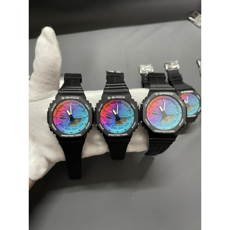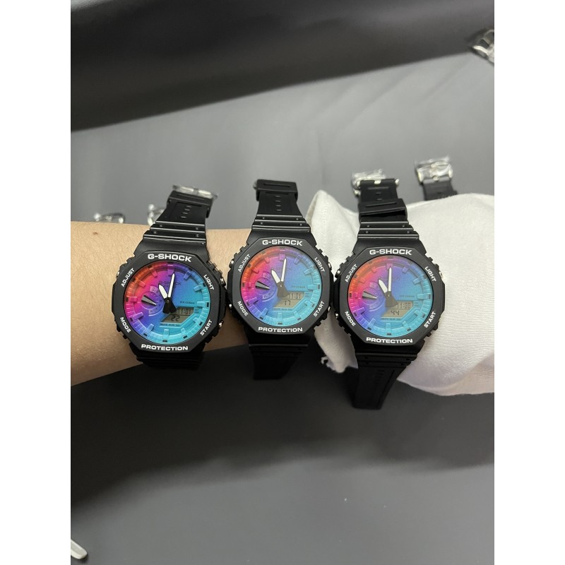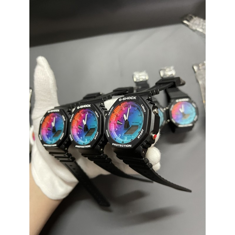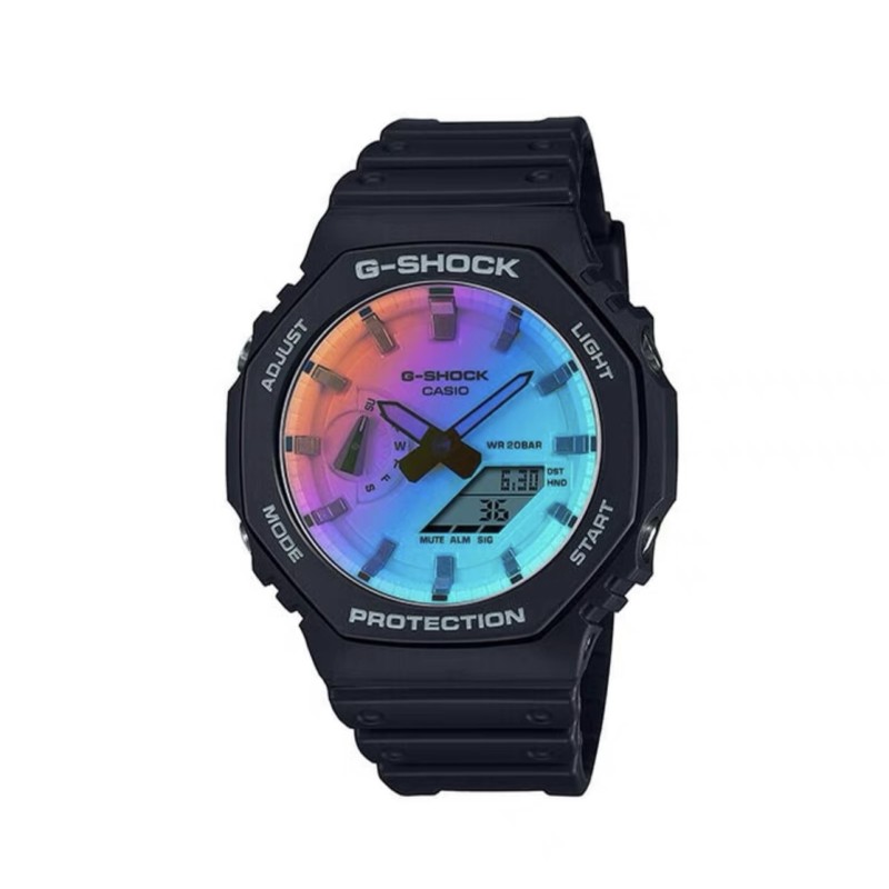 冰川炫彩镭射系列限量款 型号:GA~2100 功能:太阳能、秒表(精确到1/1000秒)世界时间,倒计时,闹铃,间歇响报,自动日历,45度自动抬手亮Led照明!
