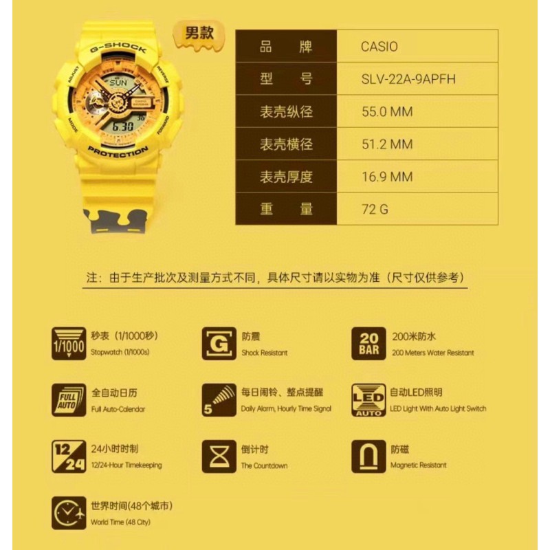 小蜜蜂联名限量款 型号:GA~110 功能:秒表(精确到1/1000秒)世界时间,倒计时,闹铃,