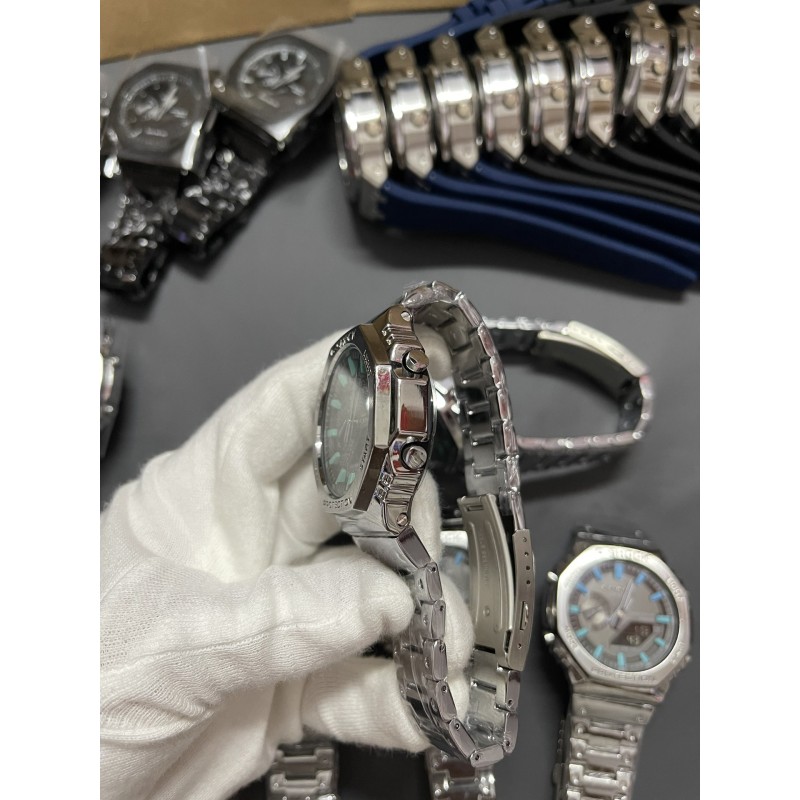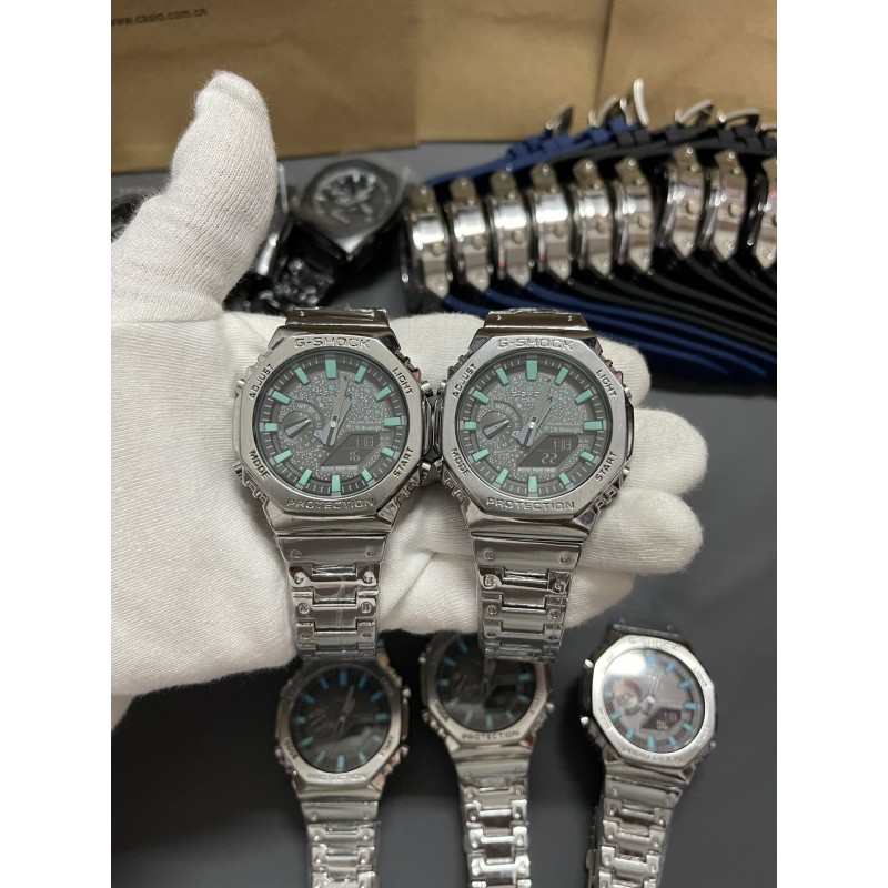 金属八角冰蓝精灵钢带系列 型号GM-B2100 功能:太阳能,秒表(精确到1/1000秒)世界时间,倒计时,闹铃,间歇响报,自动日历,45度自动抬手亮Led照明! 不锈钢表扣、全钢表带、不锈钢表壳、矿物质玻璃、不锈钢后盖、完美的刻度、原装日本机芯、机芯带双重显示~指针显示~屏幕显示、表针细磨、采用进口液晶屏、进口LED灯!
