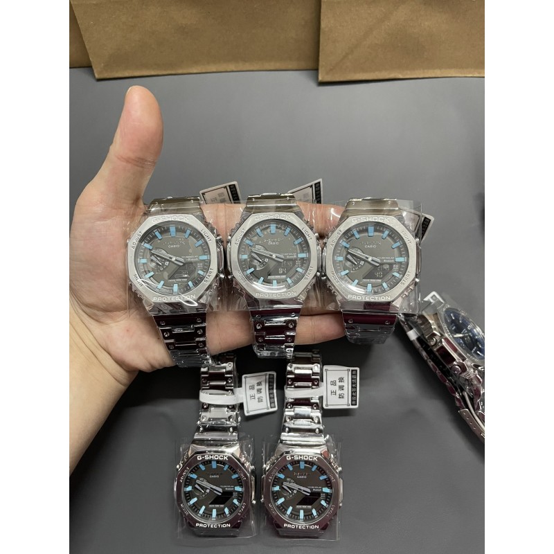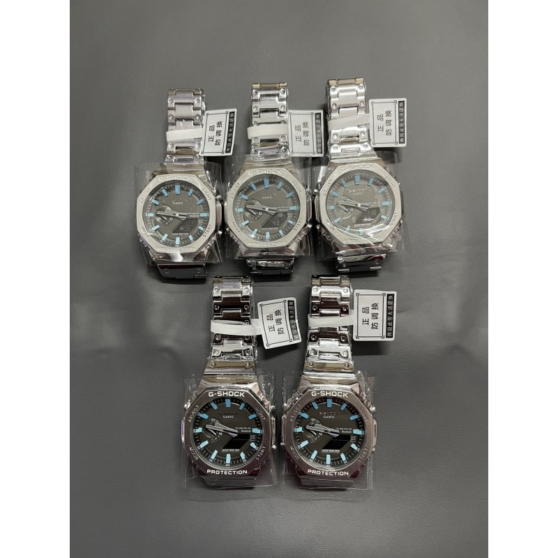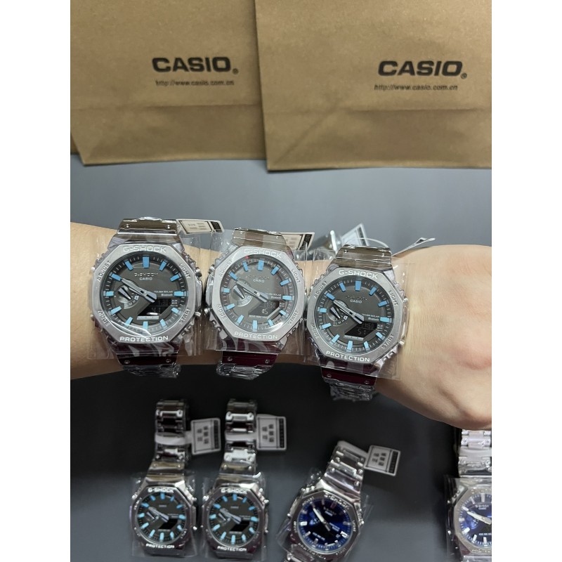 金属八角冰蓝精灵钢带系列 型号GM-B2100 功能:太阳能,秒表(精确到1/1000秒)世界时间,倒计时,闹铃,间歇响报,自动日历,45度自动抬手亮Led照明! 不锈钢表扣、全钢表带、不锈钢表壳、矿物质玻璃、不锈钢后盖、完美的刻度、原装日本机芯、机芯带双重显示~指针显示~屏幕显示、表针细磨、采用进口太阳能液晶屏、进口LED灯!