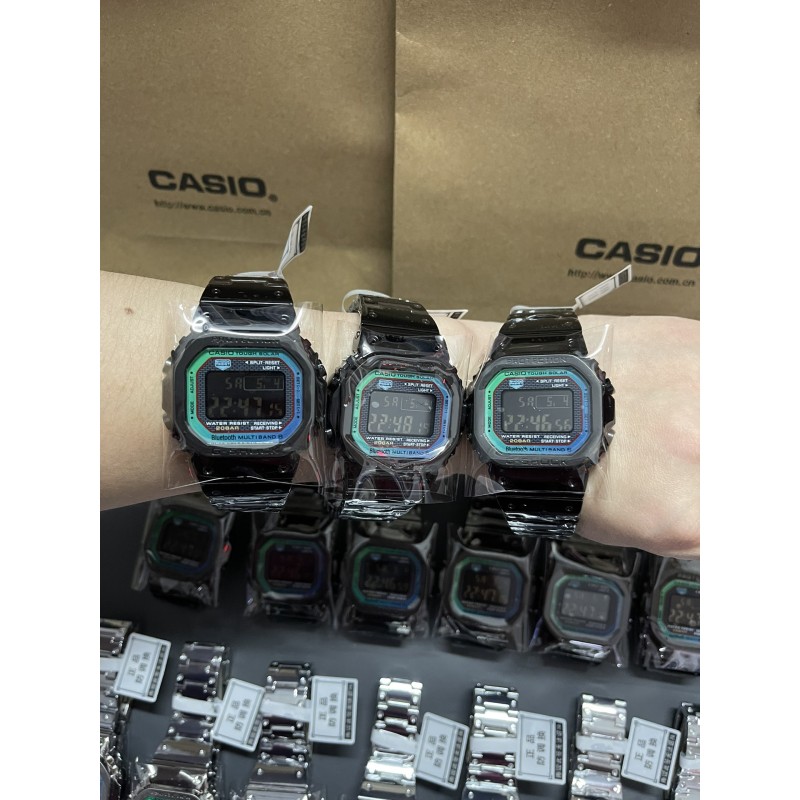 炫彩渐变冰蓝精灵钢带系列 型号:GMW-B5000 功能:太阳能,秒表(精确到1/1000秒)世界时间,倒计时,闹铃,间歇响报,自动日历,45度自动抬手亮Led照明! 不锈钢表扣、橡胶表带、不锈钢表壳、矿物质玻璃、不锈钢后盖、完美的刻度、原装日本机芯、机芯带双重显示~指针显示~屏幕显示、表针细磨、采用进口液晶屏、进口LED灯!