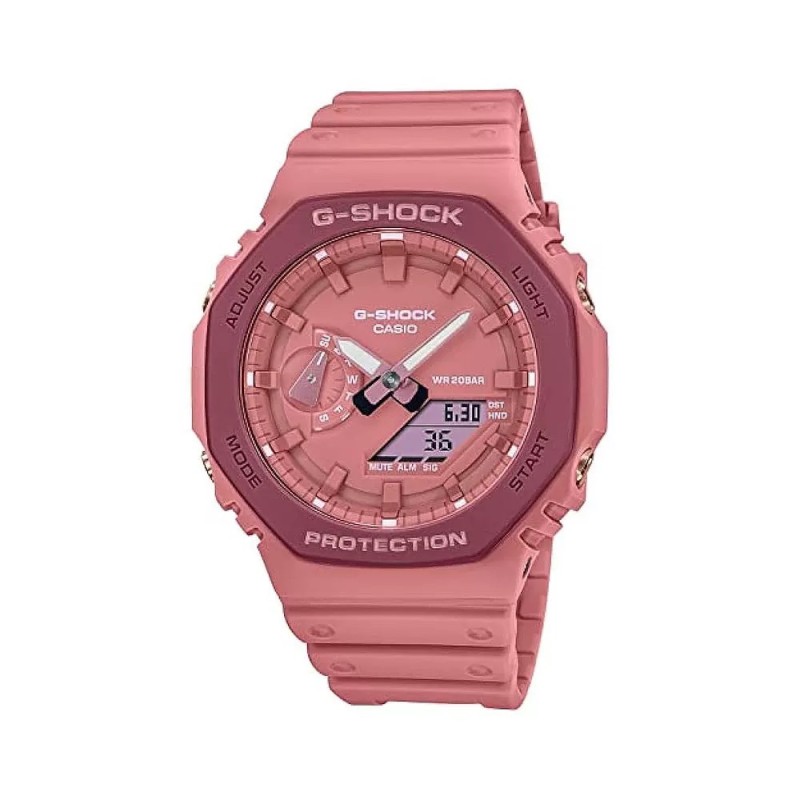 农家橡树限量款 型号:GA-2100 功能:秒表(精确到1/1000秒)世界时间,倒计时,闹铃,间歇响报,自动日历,45度自动抬手亮Led照明! 不锈钢表扣、橡胶表带、硬橡胶表壳、矿物质玻璃、不锈钢后盖、完美的刻度、原装机芯、机芯带双重显示~指针显示~屏幕显示、表针细磨、采用进口液晶屏、进口LED灯!