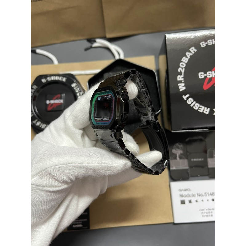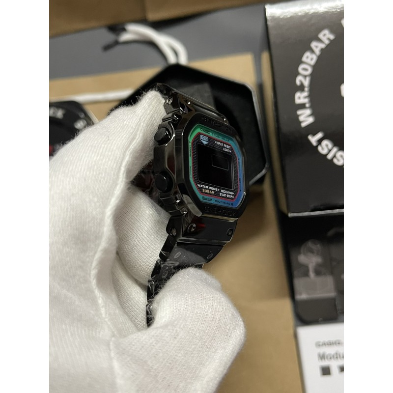 新款炫彩渐变冰蓝精灵钢带系列 型号:GMW-B5000 功能:太阳能,秒表(精确到1/1000秒)世界时间,倒计时,闹铃,间歇响报,自动日历,45度自动抬手亮Led照明!