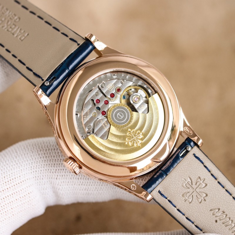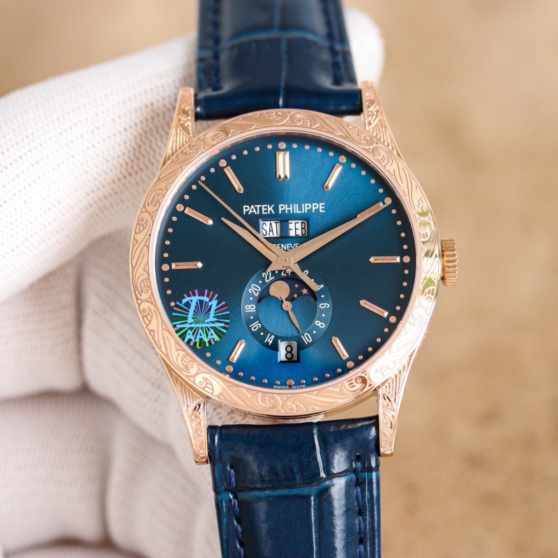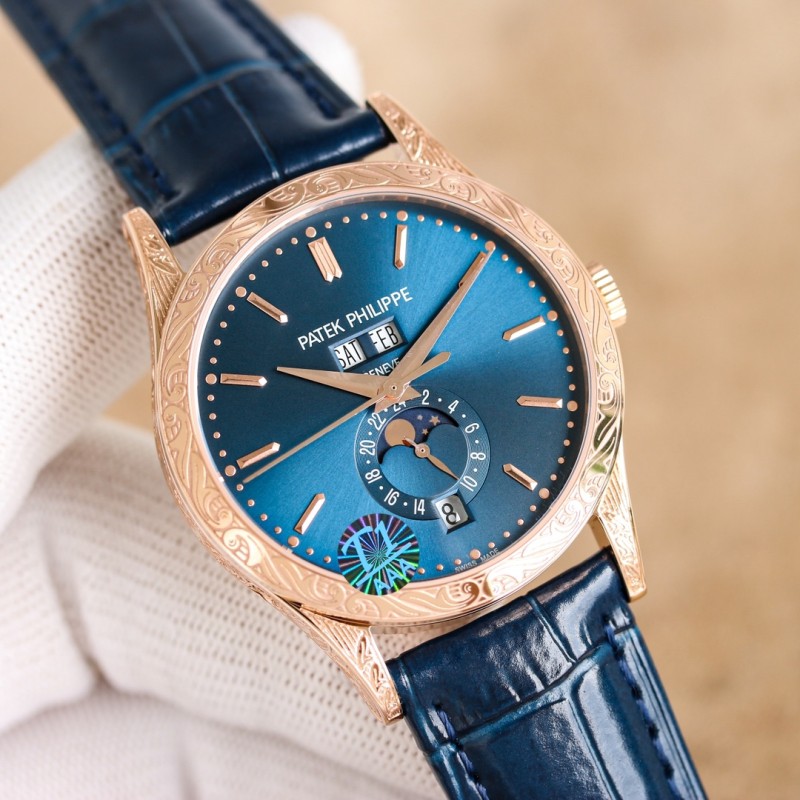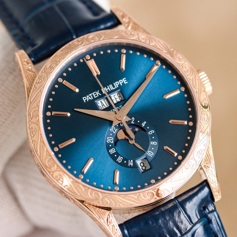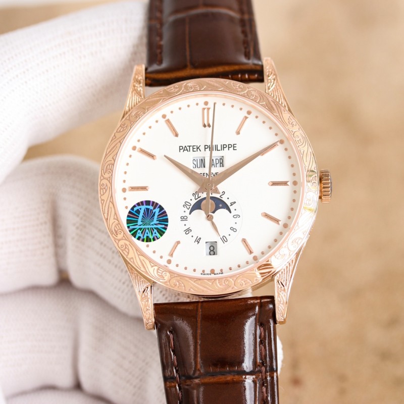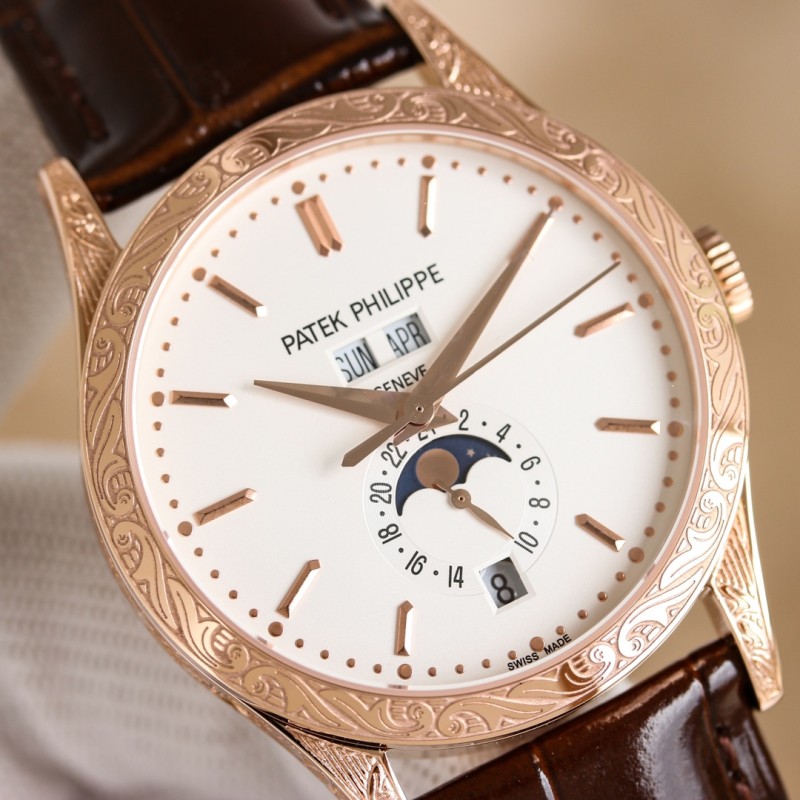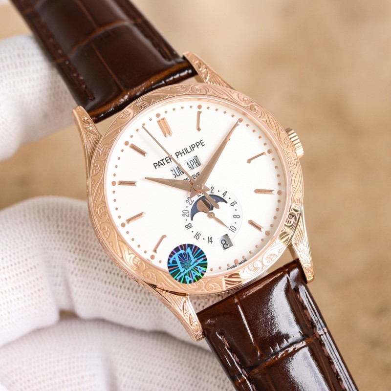 白1700 金1750 TW新推出新版本雕花壳 百达翡丽复杂功能计时5205G腕表! 1历经两年不断对机芯进行改造与调试,一贯追求以原装工艺为目标! 2直径38.5MM! 3功能同原装一致,月相/星期/月份/日历! 4字面为高难度双色渗透,非普通厂工艺! 5蓝宝石玻璃镜面,表面镀多一层通透! 6(技术突破)壳身采用巧夺天工精美雕花展示出大师的精湛技艺! 7海鸥机芯改进为一体Cal.324S机芯! 大小夹板均能做到完美倒角效果,并做镀铑加工。 8夹板采用瑞士进口宝石轴承点缀,色泽纯良,鲜艳自然。 TW匠心力作 欢迎您的品鉴!